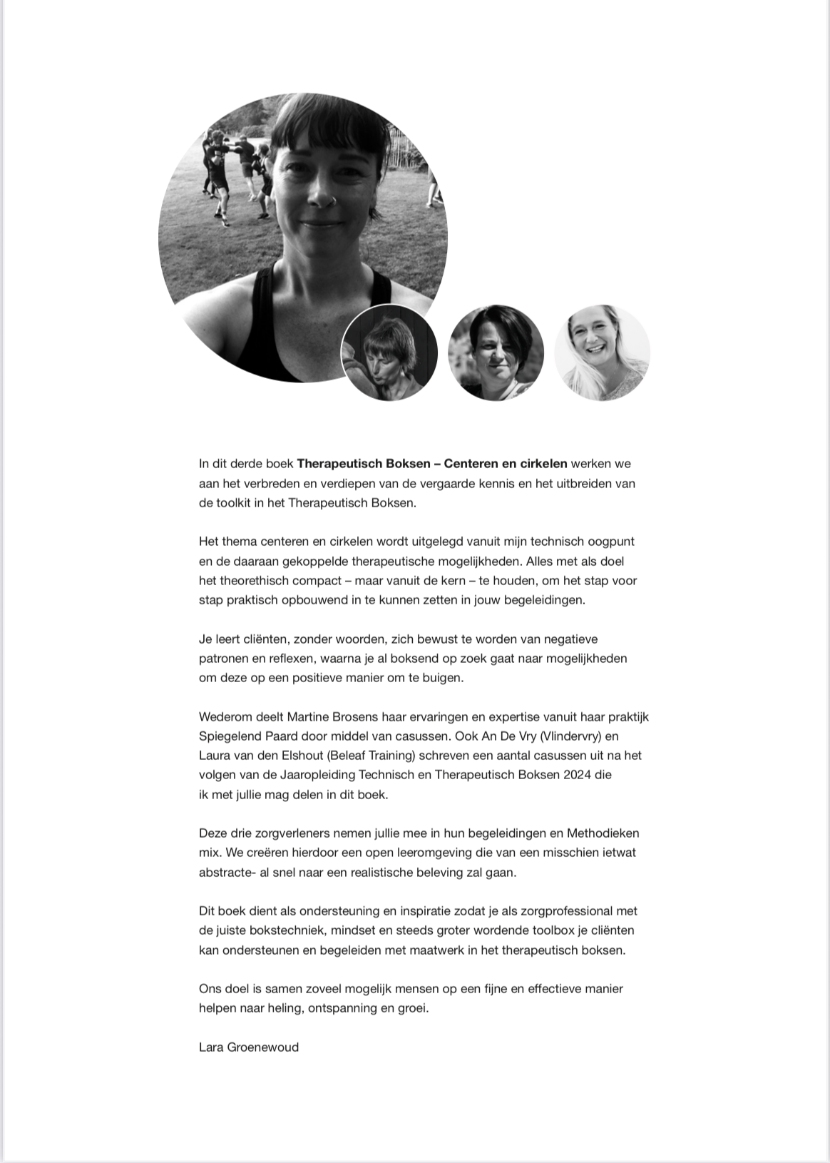 Wederom deelt Martine Brosens haar ervaringen en expertise vanuit haar praktijk Spiegelend Paard door middel van casussen. Ook An De Vry (Vlindervry) en Laura van den Elshout (Beleaf Training) schreven een aantal casussen uit na het volgen van de Jaaropleiding Technisch en Therapeutisch Boksen 2024 die ik met jullie mag delen in dit boek.